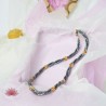 Joli collier en perles de 12mm, dans une forme semi-arrondies / semi-plates. 45cm du haut vers le bas : Cristal de roche, améthyste, sodalite, aventurine verte, calcite jaune, cornaline, jaspe rouge