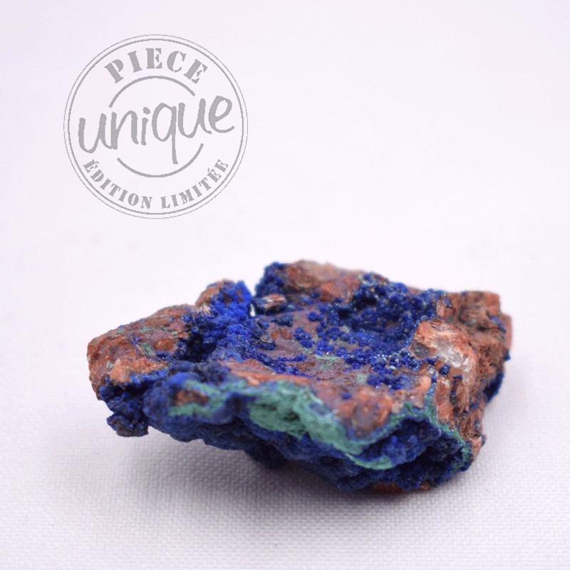 Puede presentarse en cristales prismáticos, agregados masivos o combinada con la malaquita, con la que comparte propiedades y origen. La azurita en bruto, sin tratar, es muy valorada por su pureza natural y su fuerte vibración energética.