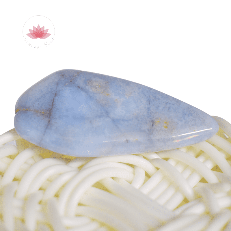 La Calcédoine est un minéral composé de cristallites de quartz microscopiques (entre 50 et 100 nanomètres), agencées en fines fibres. Il s’agit d’une phase de la silice (dioxyde de silicium, SiO₂), appartenant à la grande famille des agates. Sa texture fibreuse lui confère un éclat soyeux et légèrement translucide. Ses couleurs vont du bleu gris laiteux au mauve pâle, en passant par le blanc bleuté. La Calcédoine Blue Lace, ou “Agate rubanée bleue”, est une variété rare de calcédoine présentant de fines bandes bleues et blanches formées par des dépôts successifs de silice dans les cavités volcaniques. On la trouve principalement en Namibie, au Malawi et au Brésil, où elle se forme à basse température. C’est une pierre tendre et fragile (dureté 6,5 à 7 sur l’échelle de Mohs), sensible à la chaleur et à certains produits chimiques.