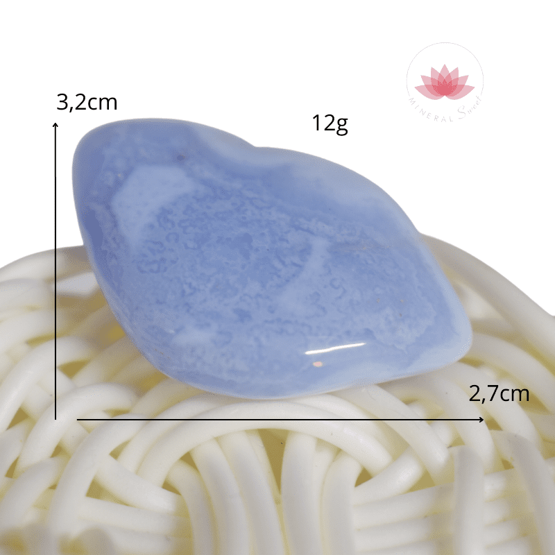 La Calcédoine est un minéral composé de cristallites de quartz microscopiques (entre 50 et 100 nanomètres), agencées en fines fibres. Il s’agit d’une phase de la silice (dioxyde de silicium, SiO₂), appartenant à la grande famille des agates. Sa texture fibreuse lui confère un éclat soyeux et légèrement translucide. Ses couleurs vont du bleu gris laiteux au mauve pâle, en passant par le blanc bleuté. La Calcédoine Blue Lace, ou “Agate rubanée bleue”, est une variété rare de calcédoine présentant de fines bandes bleues et blanches formées par des dépôts successifs de silice dans les cavités volcaniques. On la trouve principalement en Namibie, au Malawi et au Brésil, où elle se forme à basse température. C’est une pierre tendre et fragile (dureté 6,5 à 7 sur l’échelle de Mohs), sensible à la chaleur et à certains produits chimiques.