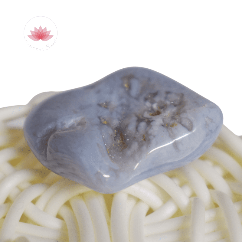 Sur le plan émotionnel, la Calcédoine agit comme une onde apaisante qui dissipe la colère, la susceptibilité et la réactivité. Elle favorise l’expression émotionnelle équilibrée : ni refoulement, ni débordement. Elle aide à transformer la parole impulsive en parole consciente, en reconnectant la voix au cœur. Comme le disait Hildegarde de Bingen, elle “apaise l’irritation du cœur et de la langue”, rétablissant l’unité entre l’émotion et la communication. Sur le plan psychique, elle stimule la lucidité, la présence d’esprit et la compréhension intuitive. Elle favorise l’écoute mutuelle et la diplomatie, tout en maintenant la clarté intérieure. Dans les situations complexes, elle aide à rester centré, calme et attentif à l’autre sans perdre son propre point d’équilibre. La Calcédoine Blue Lace — ou calcédoine rubanée bleue — agit de manière encore plus subtile et enveloppante. Elle amplifie la sérénité, adoucit les échanges et aide à trouver les mots justes lorsque les émotions dominent. Elle enseigne que la douceur est une force, et que la parole, lorsqu’elle vient du cœur, peut guérir autant que le silence.