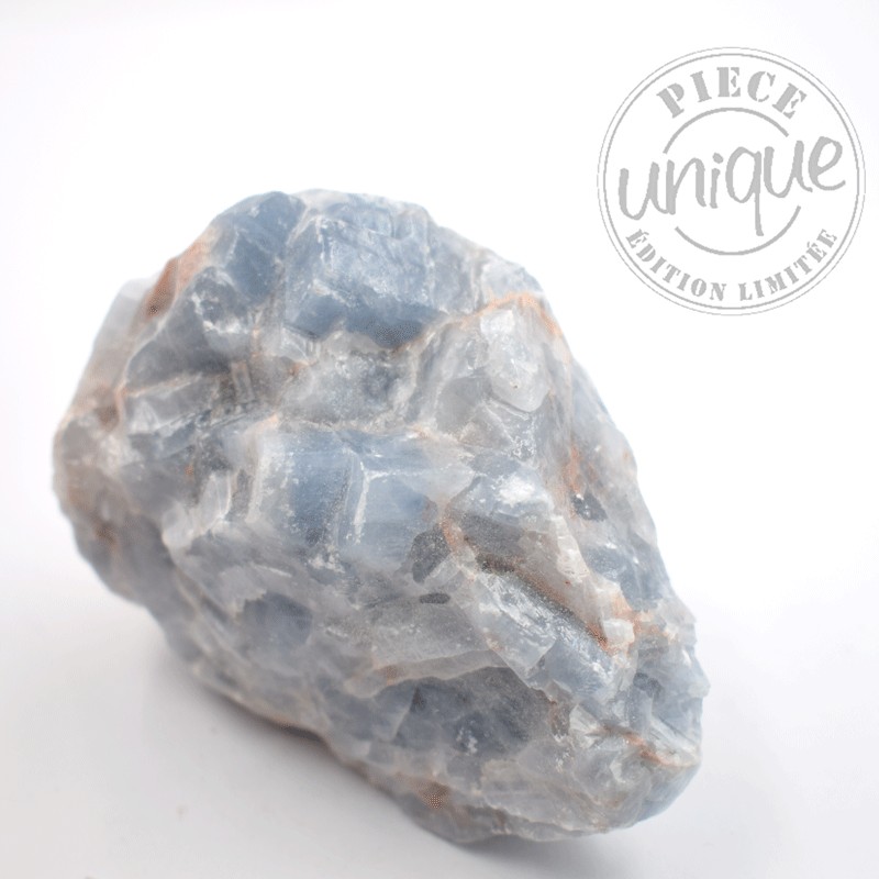 La Calcite bleue brute ou polie est une variété de calcite, un minéral appartenant à la famille des carbonates. Sa formule chimique est le carbonate de calcium, soit CaCO₃. Ce minéral est extrêmement répandu dans la croûte terrestre. Il constitue une grande partie des roches sédimentaires comme le calcaire et la craie, et entre également dans la composition du marbre, une roche métamorphique. Ce même carbonate de calcium est aussi un élément fondamental de nombreux organismes vivants : il forme les coquilles des mollusques, les structures du corail, les carapaces des crustacés et les coquilles des œufs. Sa présence dans la nature est donc aussi bien géologique que biologique.