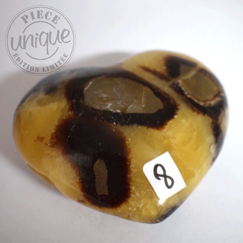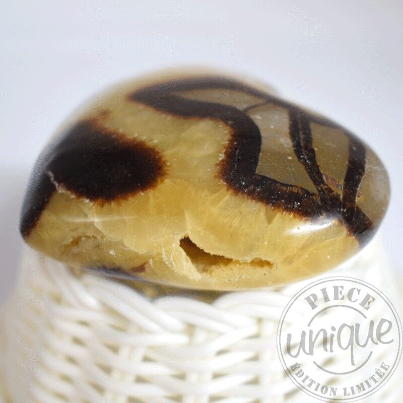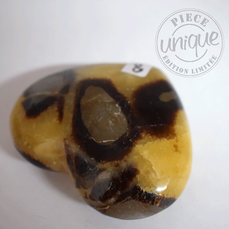 La Septaria n’est pas un minéral au sens strict du terme, mais une roche sédimentaire appelée marne septarienne, issue d’un mélange de calcaire (CaCO₃) et d’argile. Elle renferme souvent des cristallisations de calcite jaune, parfois associées à de la barite ou de l’aragonite. Sa formation remonte à plusieurs dizaines de millions d’années, lorsque des boues calcaires se sont déposées dans les fonds marins. En se desséchant, ces sédiments ont formé des fissures qui se sont progressivement comblées par des cristaux de calcite, donnant naissance à ces motifs polygonaux caractéristiques, semblables à des éclats ou à des cloisonnements internes. Les nuances de la Septaria vont du marron profond au jaune doré, parfois avec des reflets plus clairs. Cette alternance de tons lui confère une allure de terre craquelée illuminée par des rayons solaires. Bien qu’elle ne soit pas reconnue officiellement par l’IMA (International Mineralogical Association), la Septaria est étudiée pour son intérêt géologique : elle témoigne des interactions entre la matière organique, l’eau, le calcaire et les processus de minéralisation post-sédimentaires. Chaque pierre est un témoignage fossile du temps, une mémoire minérale façonnée par des millions d’années d’évolution terrestre.