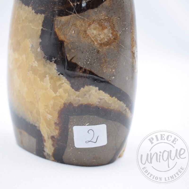 La Septaria n’est pas un minéral au sens strict du terme, mais une roche sédimentaire appelée marne septarienne, issue d’un mélange de calcaire (CaCO₃) et d’argile. Elle renferme souvent des cristallisations de calcite jaune, parfois associées à de la barite ou de l’aragonite. Sa formation remonte à plusieurs dizaines de millions d’années, lorsque des boues calcaires se sont déposées dans les fonds marins. En se desséchant, ces sédiments ont formé des fissures qui se sont progressivement comblées par des cristaux de calcite, donnant naissance à ces motifs polygonaux caractéristiques, semblables à des éclats ou à des cloisonnements internes. Les nuances de la Septaria vont du marron profond au jaune doré, parfois avec des reflets plus clairs. Cette alternance de tons lui confère une allure de terre craquelée illuminée par des rayons solaires. Bien qu’elle ne soit pas reconnue officiellement par l’IMA (International Mineralogical Association), la Septaria est étudiée pour son intérêt géologique : elle témoigne des interactions entre la matière organique, l’eau, le calcaire et les processus de minéralisation post-sédimentaires. Chaque pierre est un témoignage fossile du temps, une mémoire minérale façonnée par des millions d’années d’évolution terrestre.